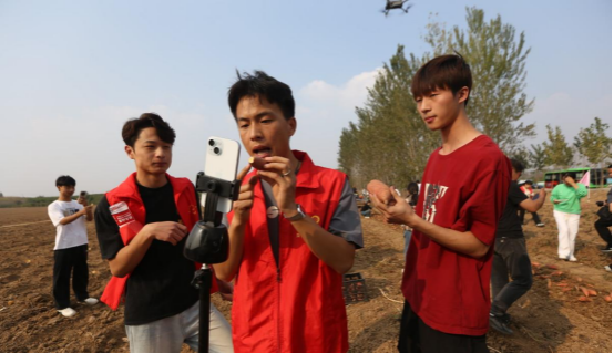 黄寨镇党委书记郑春来、镇长郭涛带领大家参观万亩蜜薯产业园,对蜜薯的生长环境、种植技术及产量做了详细介绍。网络营销与直播电商专业的学生把直播设备搬到田间地头,将学到的专业知识和实训技能应用到直播销售蜜薯活动中,用小屏幕打开大市场,进一步提升社会实践能力。部分学生在黄寨大嫂志愿者的带领下,积极参与了蜜薯的采集与筛选工作,丰富产品知识,提升直播效益,助力乡村振兴。