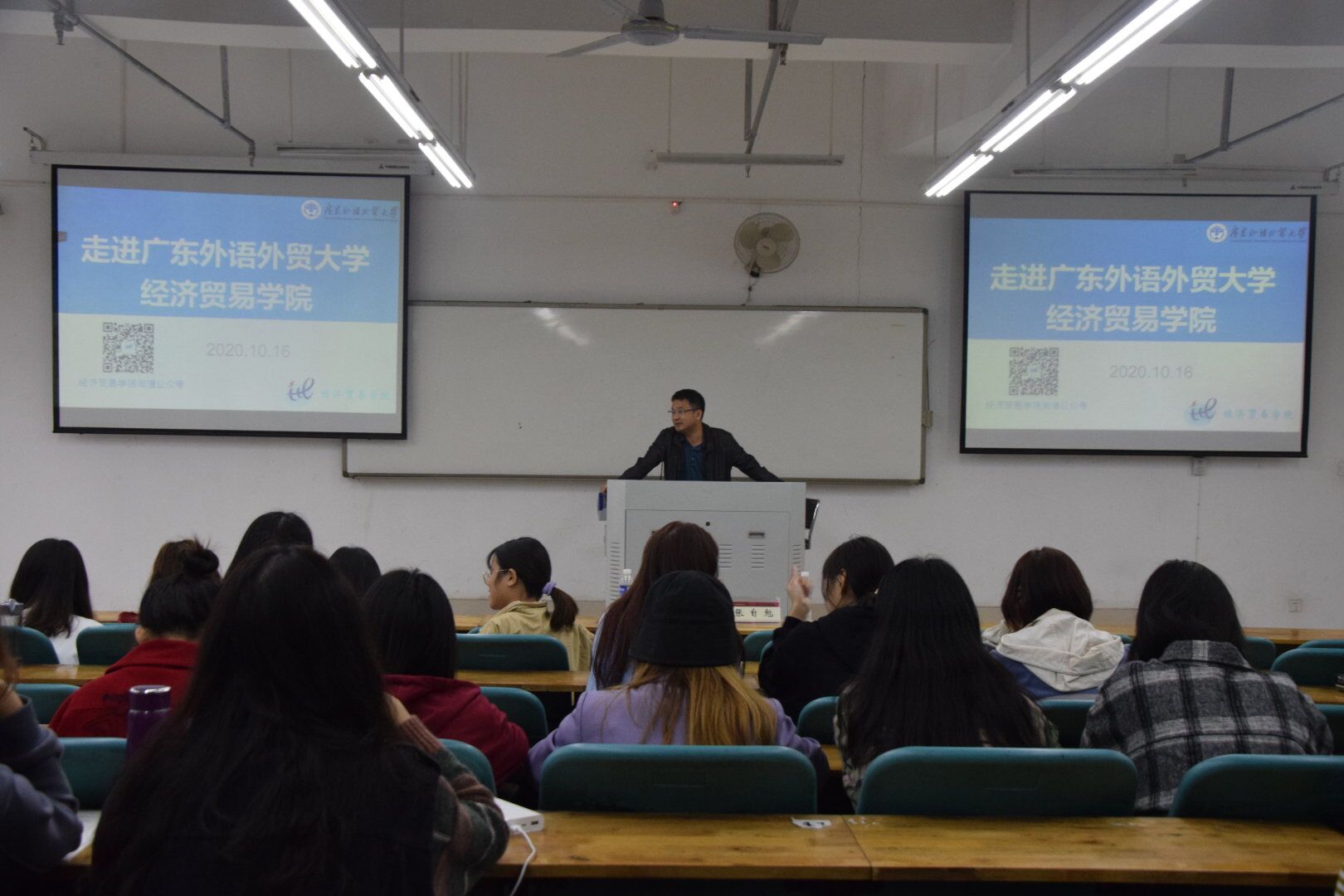 会议伊始,广东外语外贸大学招办张老师向同学们介绍了学校地理位置、专业设置以及经济贸易学院的优势特点、办学定位和研究方向。随后,张老师介绍了学校毕业生就业优势和状况,为有意报考学生指明了良好就业前景。最后,张老师对现场学生提出的有关考研等方面的问题做出了详细回答,让同学们对广东外语外贸大学及考研准备工作有了更为全面的了解。