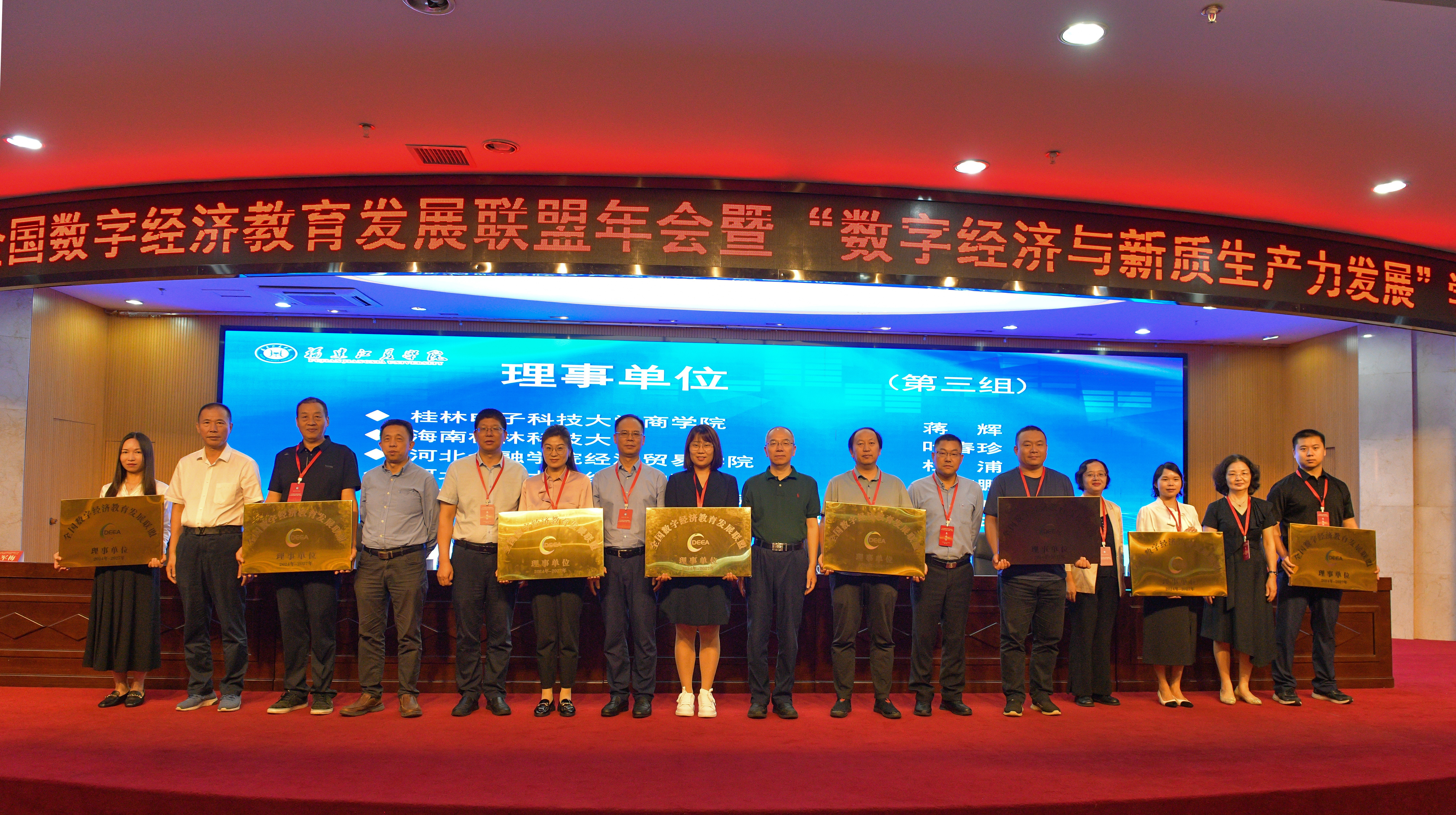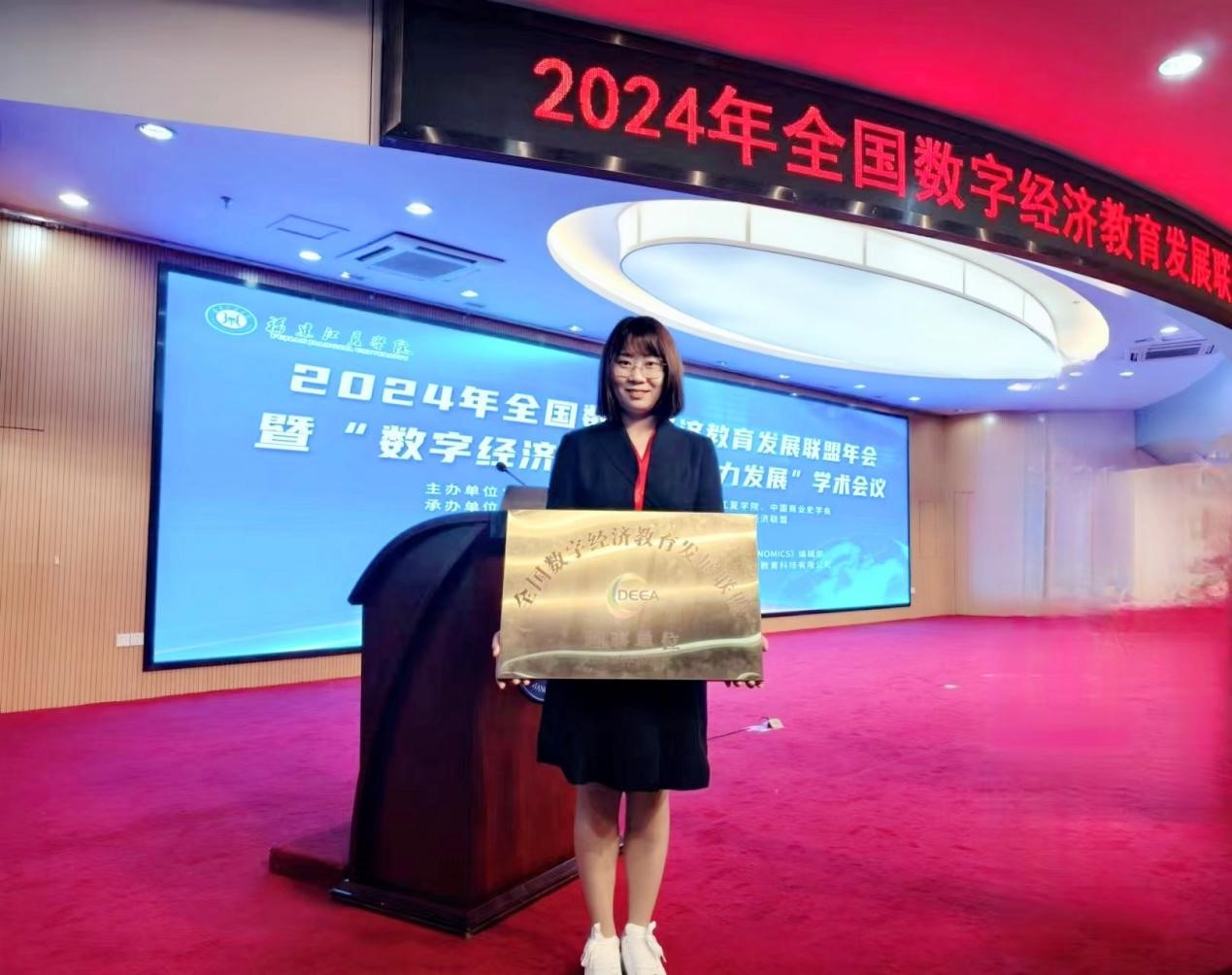 在年会开幕式上,弓媛媛代表学院参加全国数字经济教育发展联盟的授牌仪式,正式成为“全国数字经济教育发展联盟”理事单位。全国数字经济教育发展联盟是由中国人民大学、南京大学、中央财经大学等发起,汇聚了众多国内顶尖高校、科研机构及企业,旨在共同推进数字经济教育事业的创新和发展。此次获授牌成为全国数字经济教育发展联盟理事单位,标志着开云kaiyun体育数字经济学科建设和人才培养获得了国内数字经济教育界的认可,也是对学校数字经济专业建设与发展的鼓励和支持。