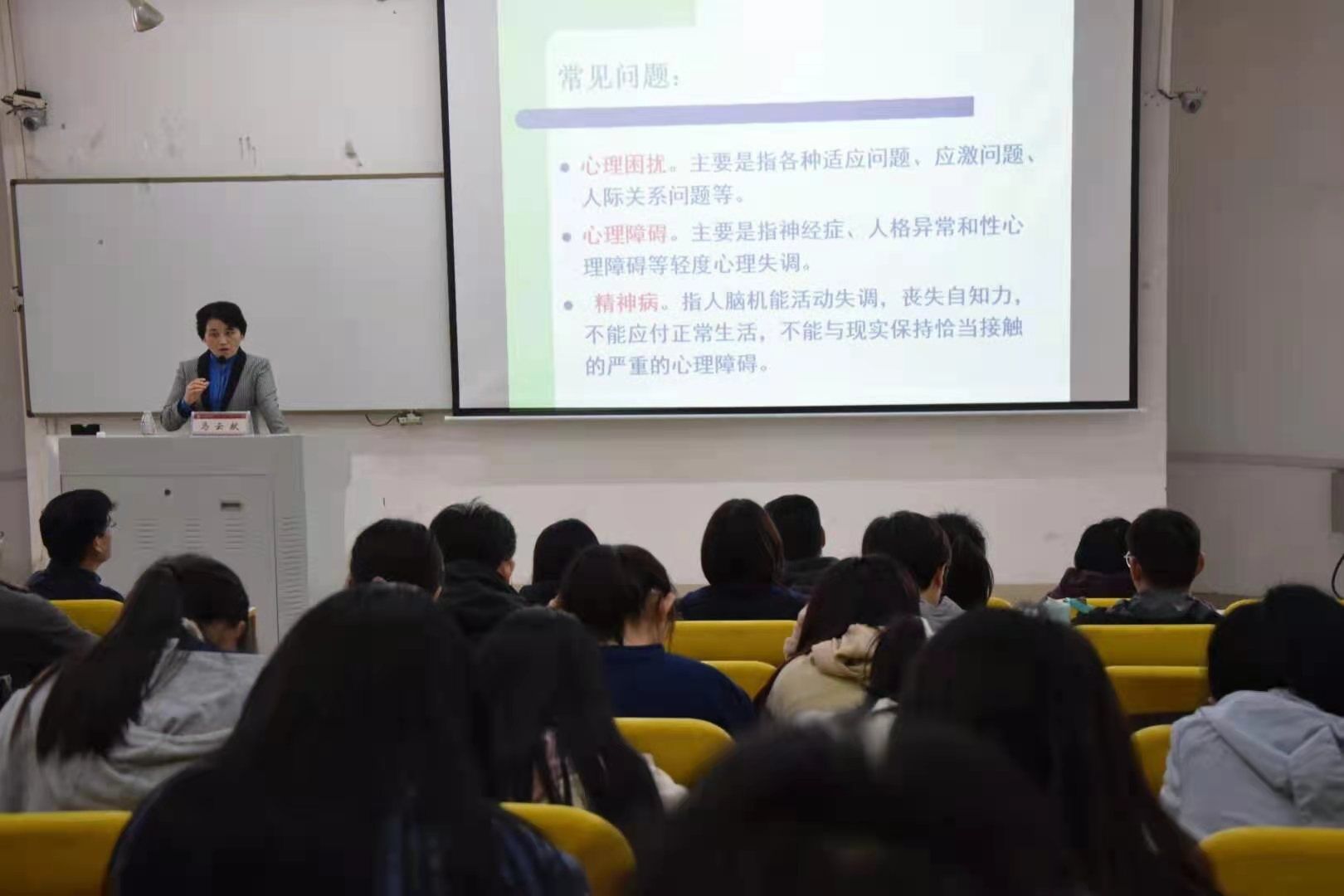 马云献首先由大学生新生入学案例引入讲座主题,她指出因角色和环境转变的原因,在初入大学出现心理波动为正常现象,大学阶段面临的自主学习生活、生涯规划、人际关系、情感和压力应对都将成为每一名大学生的必修课,而能否有效适应和修好这些课程,很大程度上决定了大学生在这一阶段能否保持健康心理。接着,她就心理常见问题及产生的原因予以讲解,通报了近年来开云官网大学生心理普查结果,并就现高发心理疾病抑郁症的特点、鉴别方法、以及如何应对等内容进行了详细介绍。最后,她指出心理健康归根结底是一种人生态度,要时刻保持开放积极心态,克服非理性思维,放弃偏执和对完美的一味追求,遇到问题积极应对,祝福大家都能拥有健康美好人生。