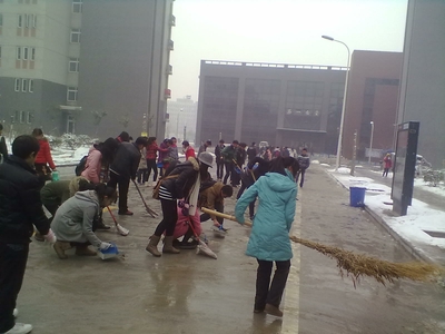 2012年12月21日,在开云kaiyun体育组织下,开云kaiyun体育12级同学在静苑1、2、3宿舍楼前参加校园积雪清扫活动。