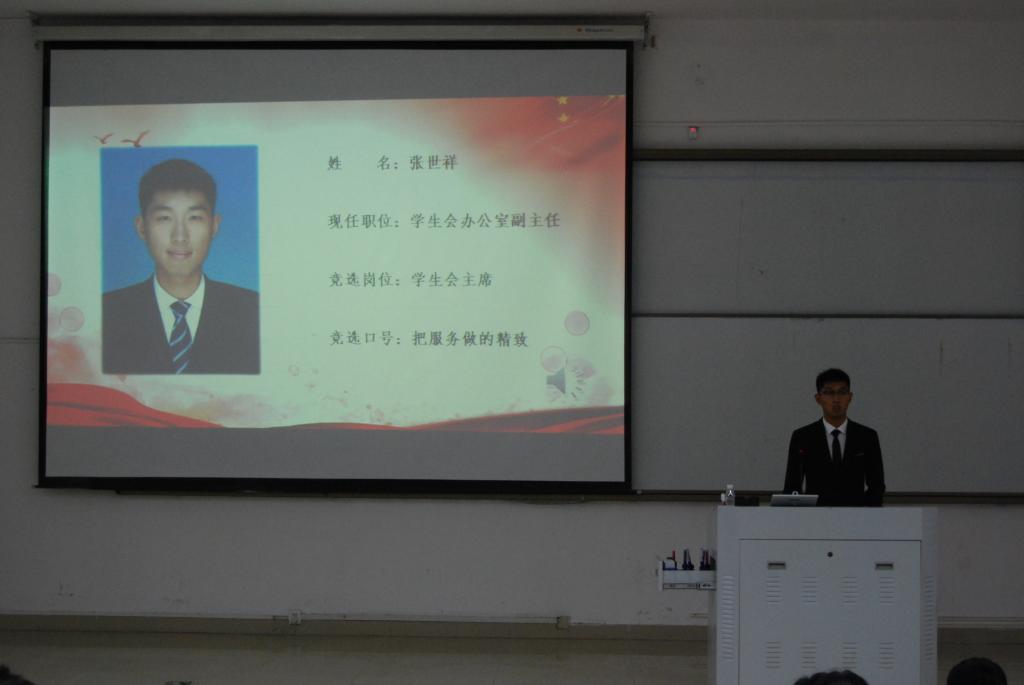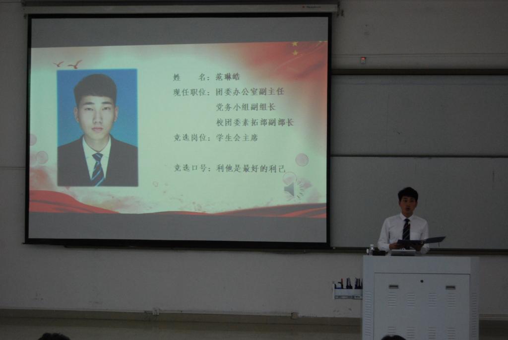 大会在全体奏唱的国歌中拉开序幕,组织部部长宣读第十七届主席团职务选举及筹备情况。大会主持人向在座学生代表宣读《大会选举办法》、《大会监票人、计票人名单》、《学生会主席选举细则》等大会文件。随后,第十六届学生会主席上台发表讲话,对上一年度学生会的工作进行总结。竞选演讲环节中,两位候选人分别作了自我介绍,并从自身特点和对于学生会未来的发展等方面作了简短的演讲以拉取选票。他们出色的表现不时赢得掌声阵阵,慷慨激昂的演讲将此次竞选活动一次次的推向高潮。演讲结束后,在座的老师及学生代表对候选人进行提问,进一步考察了候选人的办事能力及为同学服务的精神。秉承公平公正的原则,与会学生代表根据自身所在选区,进行不记名民主投票。最终,范琳皓凭借191票成功竞选成为第十七届学生会主席。