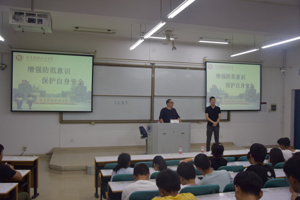 保卫处处长魏保平、团委副书记刘洋出席会议,就“增强防范意识,保护自身安全”进行讲说。魏处长首先从预防电信诈骗讲起,分列了网贷的正确处理方式、手机丢失后的做法等,又为新生讲解了短信诈骗,微信诈骗,电话诈骗,贷款诈骗等一系列电信诈骗方式。紧接着魏处长以消防安全、防传销和毒品、防宗教渗透为主要内容解释了与大学生生活息息相关的安全事项。