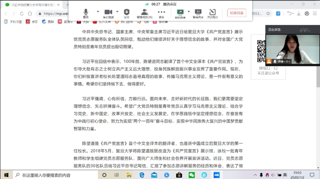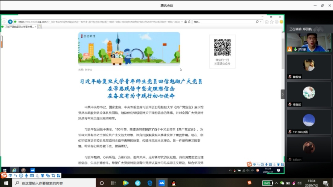 为深入研究习近平总书记的回信精神,7月2日,我院积极组织团员青年学习《习近平回信复旦大学青年师生党员:心有所信,方能行远》,采用线上视频会议的方式,由每班的团支书来引导着大家学习其中的精神。