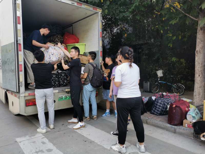 为减轻学生搬运行李的负担,魏梦媛、刘洋以及李楠老师带领学生干部将行李搬离卡车,并形成流水线往返于卡车和宿舍楼下,切实解决了学生行李重,运送难的问题。