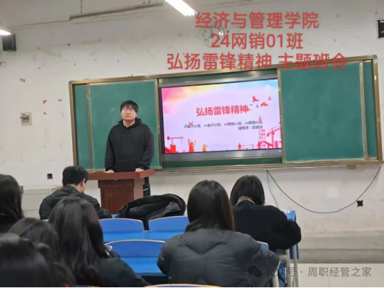 班会期间,辅导员通过图文展示、视频播放等形式,生动地展现了雷锋的生平事迹。从雷锋坚持帮助邻里、为战友排忧解难,到他在工作中始终保持的敬业与热忱,桩桩件件都让同学们深受触动。在热烈的讨论环节,同学们结合自身经历,分享了对雷锋精神的理解:有的同学讲述了自己在社区志愿服务中的点滴,有的则反思如何在日常小事中进一步践行雷锋精神。