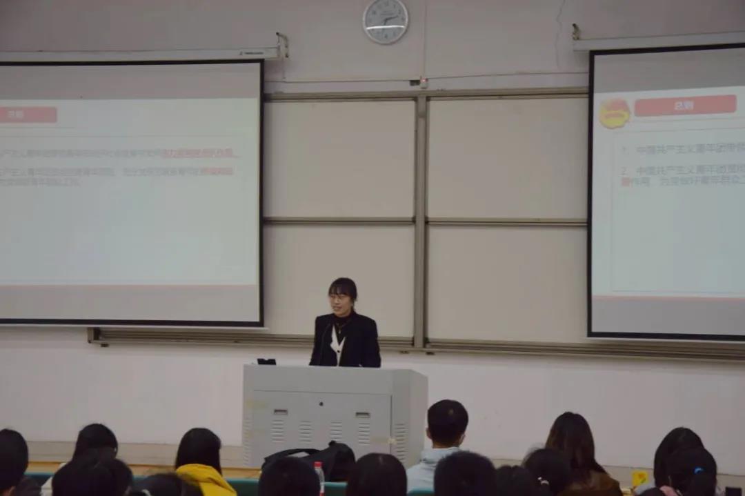 魏梦媛结合《中国共产主义青年团章程》,以PPT的形式,条理有序的从总则、团员、团的组织制度、团的中央组织、团的基层组织、团的干部、团的纪律以及团旗团徽团歌八个方面为新生展开详细讲解。同时,她还指出团员要认真学习团的基本知识,提高服务人民的本领,号召同学们在经济社会发展中发挥主力军和突击队作用,努力成为新时代优秀的共青团员!