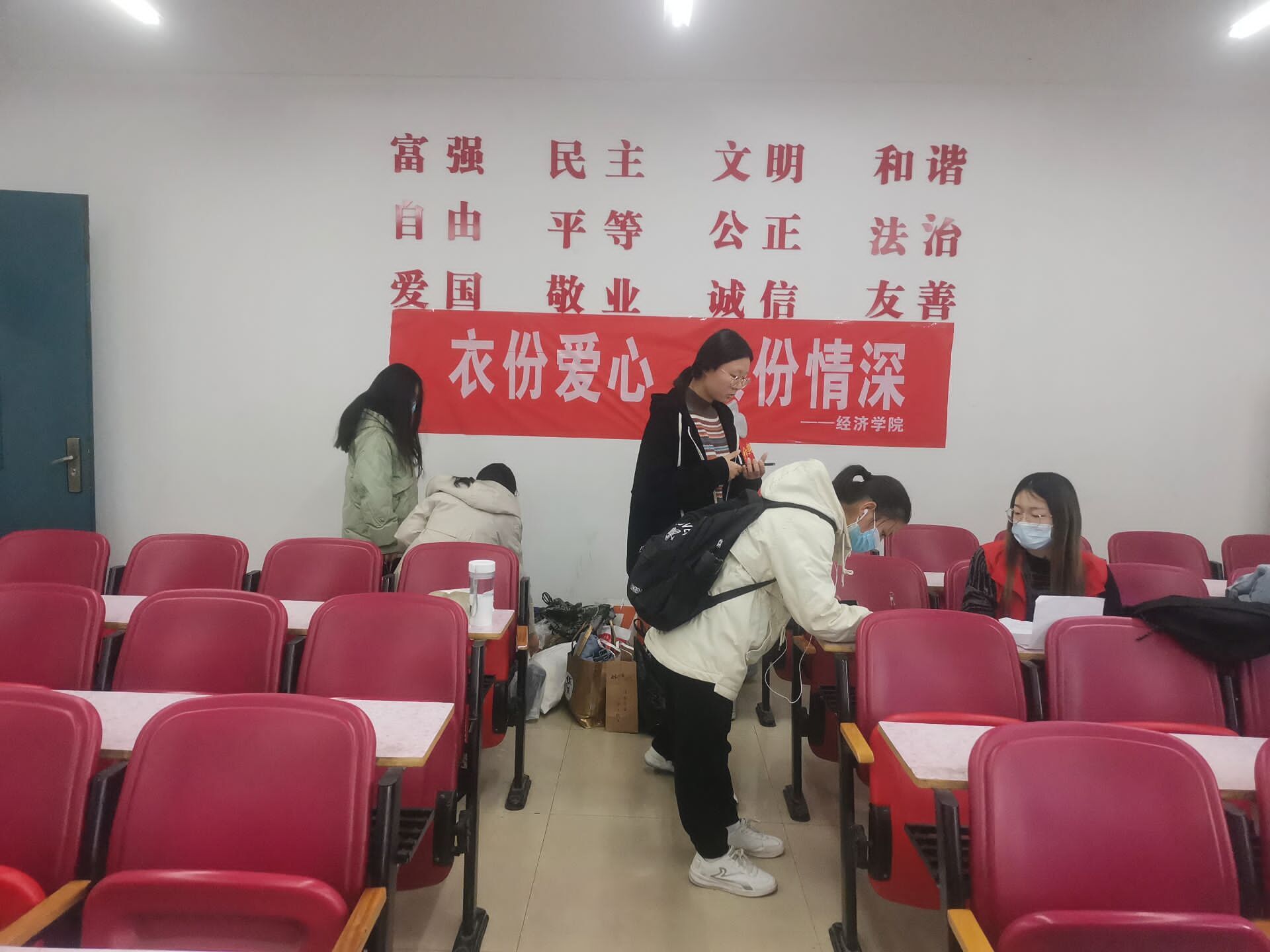 活动现场,工作人员提前张贴条幅,准备衣袋。各组值班人员做好交接工作,对献爱心的同学进行登记。同时,志愿者们身着志愿马甲,热情认真地引导同学们按照捐衣流程有序开展活动。最后,全体志愿者对收集到的衣服进行整理装袋,在活动场地集合拍照留念,并由活动负责人代表全体活动人员将所得衣物捐给提前取得联系的慈善机构。