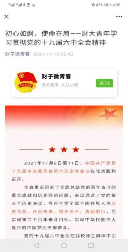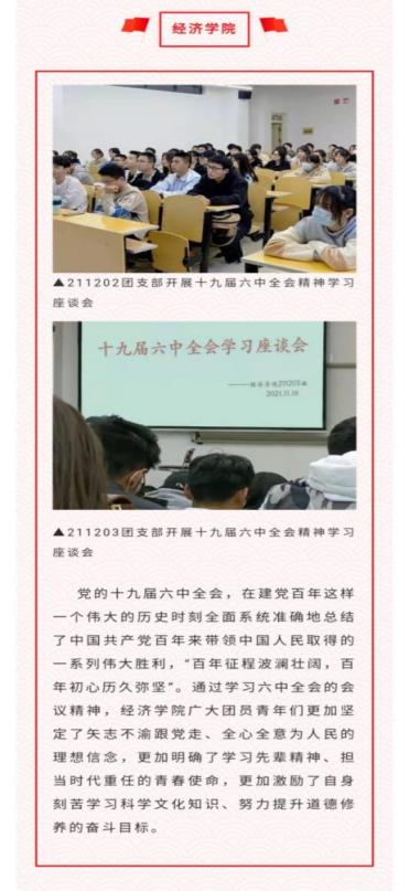 党的十九届六中全会在开云官网师生群体中引起热烈反响。各院系团委、团总支认真落实部署安排,及时开展组织化学习;财大团员青年力争上游、不甘落后,形成了以学习党的十九届六中全会精神为荣的良好校园氛围。