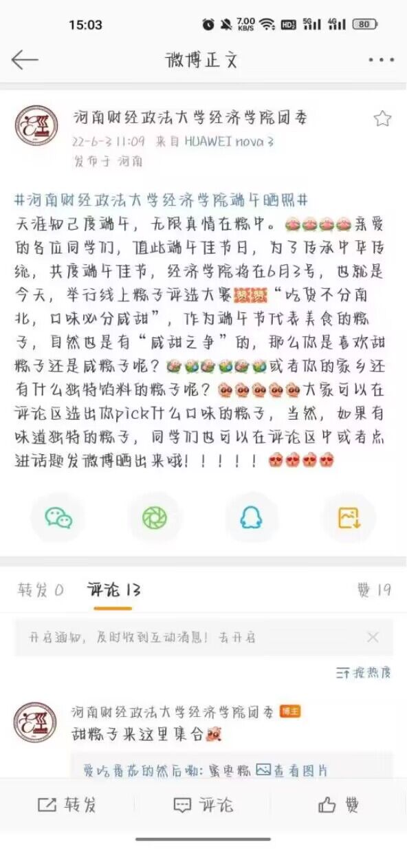 本次活动通过线上调制粽子馅料视频分享,亲手包粽子教程,以及甜咸党粽子之争等各式各样活动,结合院团委官博的首次运营,让各位同学能更真切的去感受中国传统节日的内涵,了解更多具体的工艺,以轻松的方式进一步锻炼全体同学的动手能力和学习能力。让学生能在线上体验到从前线下活动的热烈氛围。本次活动丰富同学们的课余生活,促进同学之间的以及同学和家人之间的沟通与交流,增进互相的了解。同时弘扬我们的传统文化,积累我们的文化精髓。