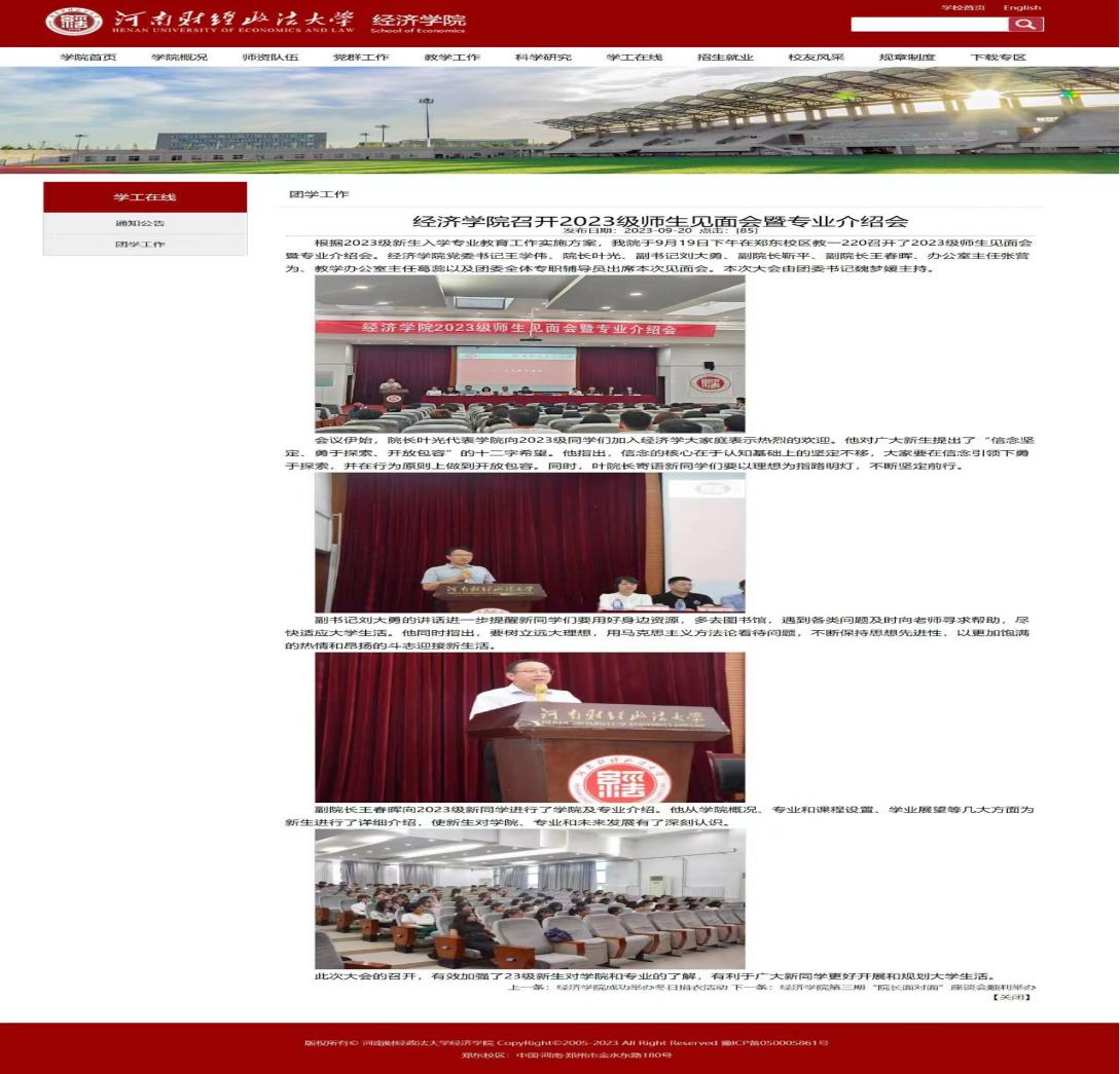 为促进我院学生深入了解我院师资及各专业,我院于9月19日下午在郑东校区教一220召开2023级师生见面会暨专业介绍会。开云kaiyun体育领导班子、相关老师及23级全体学生相见于本次见面会。此次见面会的举办,充分展现了我院对新生教育工作的重视,同时让学生认识了我院的基本情况,增加了师生间的联系。愿在学院和广大学生的共同努力下,不断加强学院学生绩效,使我院师生能力不断提高,未来将围绕学生、指引学生、服务学生做到实处。
