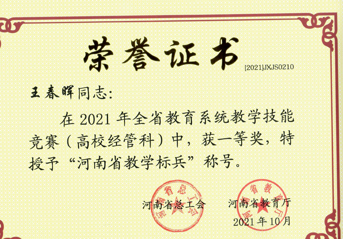 近日,河南省教育厅、河南省教育工会委员会联合下发《关于表彰2021年全省教学技能竞赛获奖个人的决定》(豫工文[2021]89号)文件,表彰河南省2018年度教学技能竞赛获奖个人。我院教师王春晖、侯晓东分别荣获一等奖和二等奖。该项活动调动了教师练技能、强素质的热情,有助于青年教师不断创新教学方法,刻苦钻研教学技能,努力提高自身素质和教学水平。