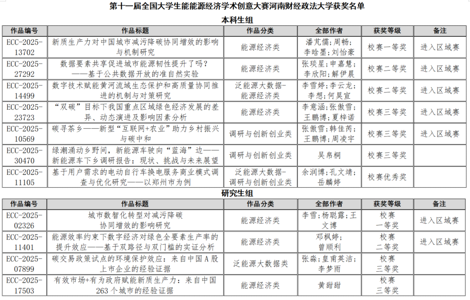 第十一届全国大学生能源经济学术创意大赛,开云官网报名21项,提交作品21项,经形式审查,有效作品21项。经学校组织书面评审,本科生组作品7项,研究生作品4项入围线下现场答辩环节。