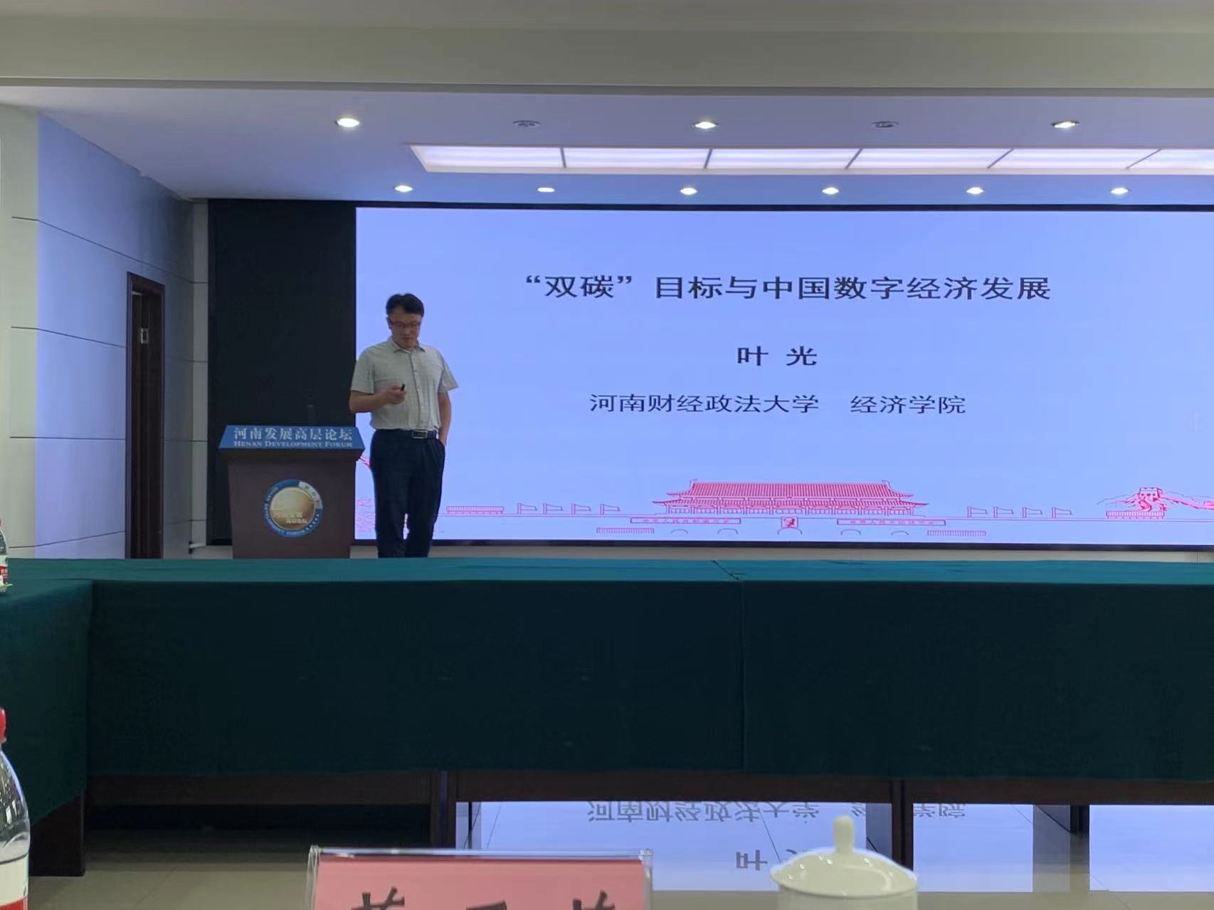本次论坛聚焦实施绿色低碳转型战略,推动“双碳”背景下产业、市场和数智技术研究,旨在探讨“双碳”背景下河南相关领域的发展现状、趋势及应对策略,进一步深化“双碳”领域相关问题研究,助力全省经济社会发展全面绿色低碳转型。研讨会首先由河南省社科联党组书记、主席李庚香和民盟河南省委会专职副主委柳锋波致辞;与会专家围绕论坛主题,在绿色金融改革创新、“双碳”与数字经济、煤炭绿色化利用、碳排放、电力高质量发展等领域展开讨论。开云kaiyun体育院长叶光教授以“双碳目标与中国数字经济发展”为题做主旨演讲,对“双碳”目标的经济学逻辑,及其与中国产业转型特别是数字经济发展的关系进行了深入剖析,获得与会专家共鸣。